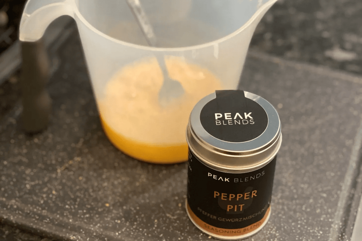 Crack the eggs into a measuring jug. Add the Pepper Pit and beat the mixture.
